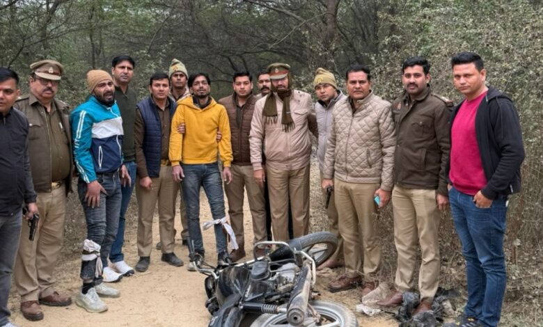 Noida ll थाना सूरजपुर पुलिस द्वारा मोजर वियर गोलचक्कर के पास सर्विस रोड पर चैकिंग की जा रही थी, कि तभी दो व्यक्ति एक मोटरसाइकिल से आते हुये दिखाई दिये, पुलिस बल द्वारा रूकने का ईशारा किया गया तो उपरोक्त मोटरसाइकिल सवार व्यक्तियो द्वारा मोटर साइकिल मोडकर रेलवे लाईन के किनारे किनारे जंगल की तरफ भागने का प्रयास किया गया। शक होने पर पुलिस बल द्वारा पीछा किया गया। अपने आप को घिरता देख बदमाशों द्वारा जान से मारने की नियत से पुलिस पार्टी पर फायर किया। पुलिस पार्टी द्वारा की गयी आत्मरक्षार्थ जवाबी कार्यवाही में दोनों बदमाश घायल हो गये। जिनकी पहचान क्रमशः 1.सिराजूद्दीन उर्फ गुड्डू पुत्र नसीरूद्दीन निवासी ग्राम आचरू कलां थाना शिकारपुर जिला बुलन्दशहर हालपता गली न0 13 मुस्तफाबाद मस्जिद के सामने थाना गोकुलपुरी दिल्ली उम्र करीब 37 वर्ष 2.मयंक शर्मा पुत्र अवनीश शर्मा निवासी ग्राम खेडा थाना पिलखुआ जिला हापुड उम्र करीब 28 वर्ष के रूप में हुयी है। कब्जे से एक अवैध तंमचा .315 बोर व 02 जिन्दा कारतूस व 02 खोखा कारतूस तथा थाना सूरजपुर क्षेत्र के नवादा मन्दिर में हुई दानपात्र तोड कर चोरी किये गये 20700/- रू0 नगद व तिलपता गांव में एक घर में घूस कर चोरी किया गया एक मोबाइल फोन वन प्लस व 2165 रू0/- नगद व काले रंग का एक बैग व 2 आधार कार्ड तथा ताला तोड़ने के उपकरण भी बरामद हुए हैं तथा अभियुक्तगण से बरामद मो0सा0 स्प्लेंडर बिना नंबर प्लेट चोरी की है। घायल अभियुक्तगण को उपचार हेतु अस्पताल भेजा जा रहा है। अन्य विधिक कार्यवाही की जा रही है।