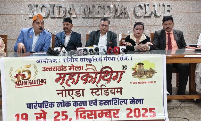 नोएडा। उत्तराखंड की समृद्ध लोक-संस्कृति, परंपराओं एवं सांस्कृतिक विरासत को सहेजने और नई पीढ़ी तक पहुँचाने के उद्देश्य से पर्वतीय सांस्कृतिक संस्था (रजि.) द्वारा 15वें उत्तराखंड महाकौथिग मेले का भव्य आयोजन किया जा रहा है। मेले को लेकर मंगलवार को नोएडा मीडिया क्लब में आयोजकों द्वारा प्रेसवार्ता कर कार्यक्रम की जानकारी दी गयी,संस्था के मुख्य संयोजक राजेंद्र चौहान ने जानकारी देते हुए बताया की यह सात दिवसीय लोक कला एवं हस्तशिल्प मेला 19 दिसंबर से 25 दिसंबर 2025 तक सेक्टर-21A स्थित नोएडा स्टेडियम में आयोजित होगा। महाकौथिग मेले में उत्तराखंड के विभिन्न अंचलों की लोकसंस्कृति की झलक देखने को मिलेगी। इसमें लोकनृत्य, लोकगीत, जागर, पारंपरिक वाद्ययंत्र, हस्तशिल्प, पारंपरिक व्यंजन एवं विविध सांस्कृतिक प्रस्तुतियाँ शामिल होंगी। इस आयोजन का मुख्य उद्देश्य उत्तराखंड की सांस्कृतिक पहचान को सशक्त करना, स्थानीय कलाकारों को मंच प्रदान करना तथा समाज के सभी वर्गों को संस्कृति से जोड़ना है।