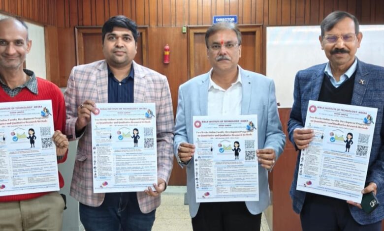 नोएडा। सेक्टर 1 स्थित बिरला इंस्टीट्यूट ऑफ टेक्नोलॉजी द्वारा 8 दिसंबर से 19 दिसंबर 2025 तक “मात्रात्मक एवं गुणात्मक शोध विधियाँ” विषय पर दो सप्ताह का ऑनलाइन शिक्षक विकास कार्यक्रम आज विधिवत शुभारम्भ किया गया। इस अवसर पर सस्थान के निदेशक प्रो. विकास त्रिपाठी, कार्यक्रम संयोजक प्रो एस एल गुप्ता, डॉ. अरुण मित्तल एवं डॉ निकेत मेहता ने कार्यक्रम की विवरणिका का विमोचन किया। दो सप्ताह तक आभासी रूप से चलने वाले इस कार्यक्रम का उद्देश्य शिक्षकों, शोधार्थियों और उद्योग पेशेवरों को आधुनिक शोध पद्धतियों, उपकरणों और उन्नत सांख्यिकीय तकनीकों की व्यावहारिक समझ प्रदान करना है। इस कार्यक्रम में देशभर के प्रतिष्ठित संस्थानों—जैसे लखनऊ विश्वविद्यालय, दिल्ली एवं रेवा विश्वविद्यालय, इंदिरा गाँधी राष्ट्रीय मुक्त विश्वविद्यालय, भारतीय प्रबंध संस्थान दिल्ली आदि केंद्रीय विश्वविद्यालयों, प्रबंधन संस्थानों तथा प्रमुख शोध संगठनों से लगभग 90 प्रतिभागी भाग ले रहे हैं।