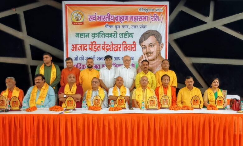 नोएडा llसर्व भारतीय ब्राह्मण महासभा गौतमबुद्ध नगर,के सौजन्य से महान क्रांतिकारी चंद्र शेखर आजाद जी की जयंती बड़ी धूम धाम से मनाया गया, यह कार्यक्रम सामाजिक एकता और राष्ट्र प्रेम का वाहक बना, मुख्य अथिति राष्ट्रीय अध्यक्ष डाक्टर सुनील शांडिल्य जी,विशिष्ट अथिति गणेश शंकर त्रिपाठी, रिटायर IAS ,डाक्टर हरीश मिश्र संचार अभियंता, सुरेश शर्मा प्रधान गिजोड़,मंडल अध्यक्ष नोएडा मनीष तिवारी,महिला मोर्चा मंडल अध्यक्ष संगीता तिवारी,मशहूर कवि अजय मिश्र,कवियत्री पल्लवी त्रिपाठी,डाक्टर राधा कांत मिश्रा,समाजसेवी दिनेश तिवारी रहे,कार्यक्रम की शुरुआत चंद्र शेखर आजाद के चित्र पर माल्यार्पण के साथ हुई,जिसने पूरे वातावरण को देश प्रेम से भर दिया,सभी अतिथियों ने अपने संबोधन में आजाद जी के जीवन उनके आदर्शो और देश के लिए उनके योगदान को याद किया,
